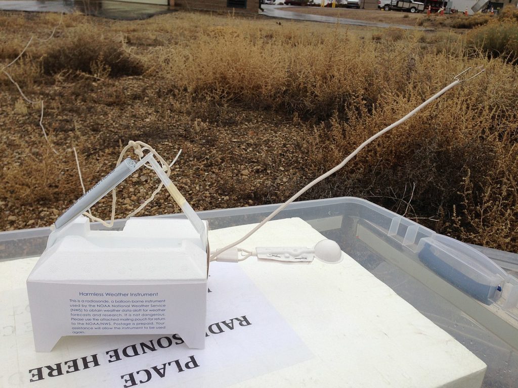 ラジオゾンデとは、以下の写真のような装置で、高度別の気象データを観測するための小型の気象測器のことです。気球に吊るして上空に飛ばして測定結果を無線通信で受け取ります。